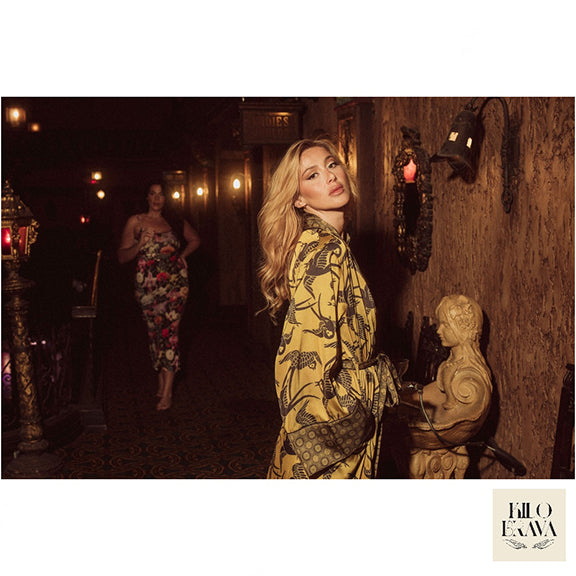 Classic Maxi Robe with pockets. Made with Kilo Brava simulated silk satin, digitally printed with an exclusive Antique Swallows patterned and trimmed with a classic medallion pattern. Luxe, sophisticated, and trend forward.
