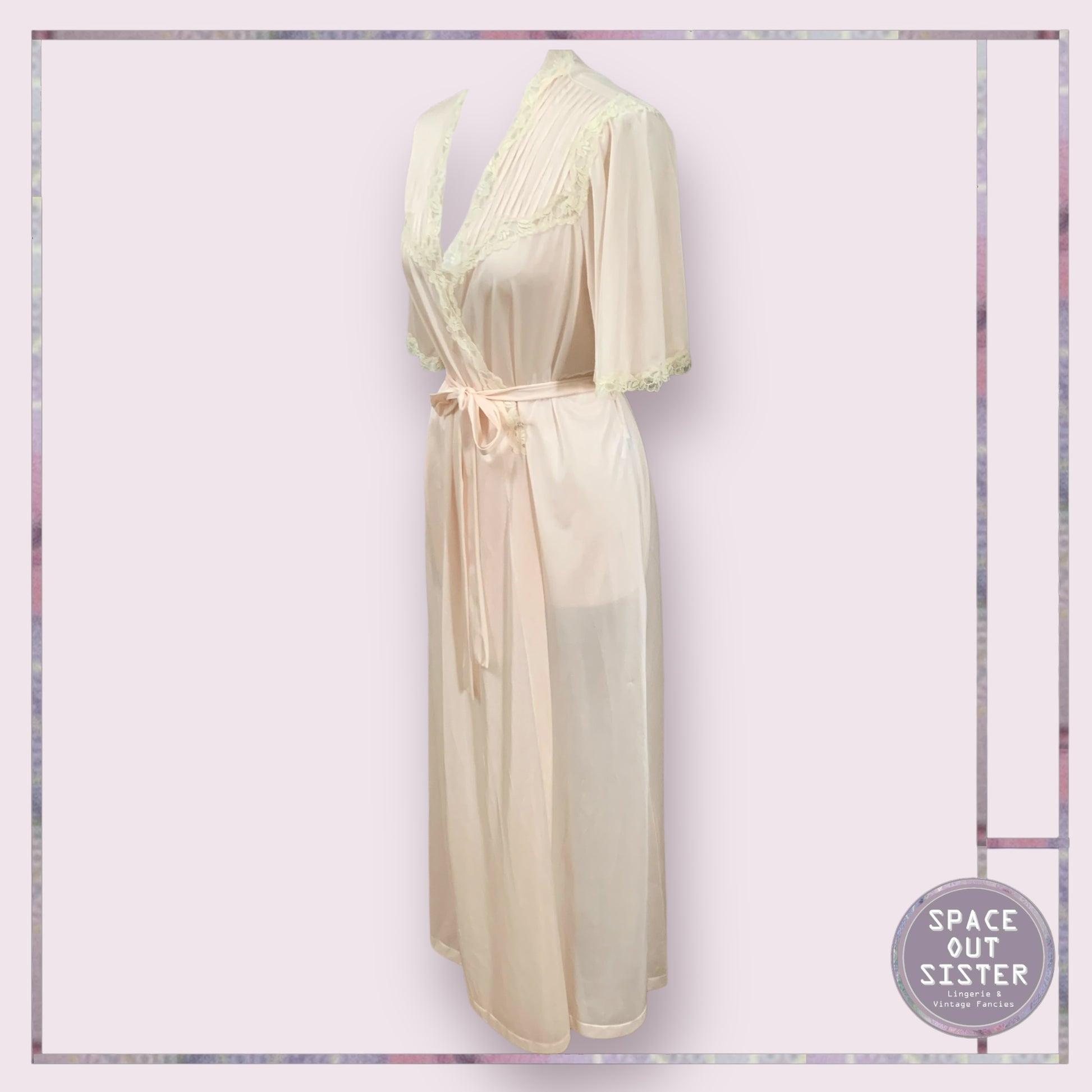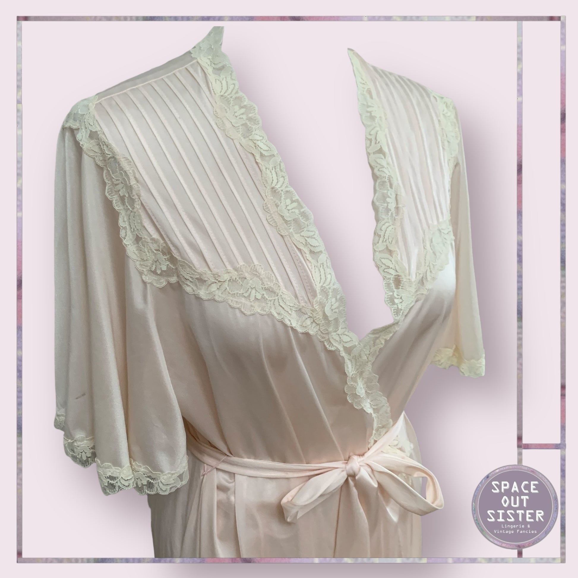 Discover pure elegance with the Vintage Vanity Fair Robe. This stunning piece features delicate pin tuck bodice detailing in a light blush pink color. The full length and butterfly sleeves add a touch of grace, while the belted waist provides a flattering fit. Elevate your wardrobe with this timeless vintage robe. As seen, some small blemishes. Please see last photo.