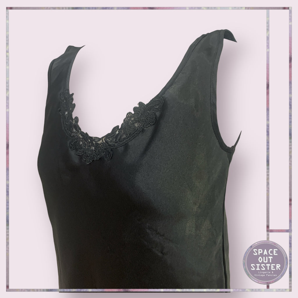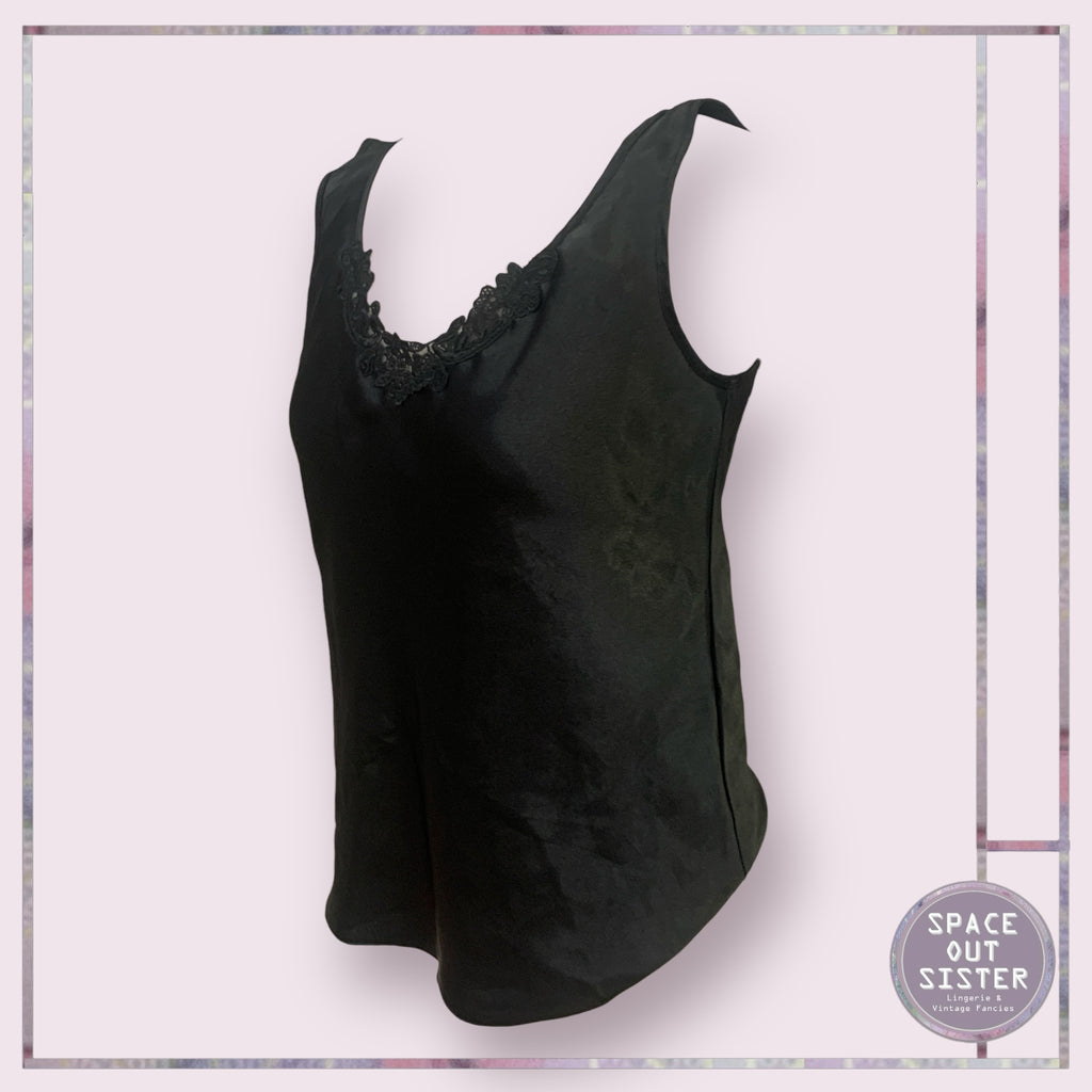 This vintage black satin camisole boasts exquisite Guipure embellishments, adding a touch of intricate detail to its classic design. As seen, please see last photo.
