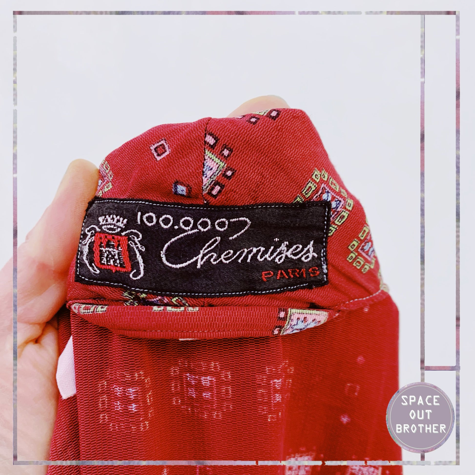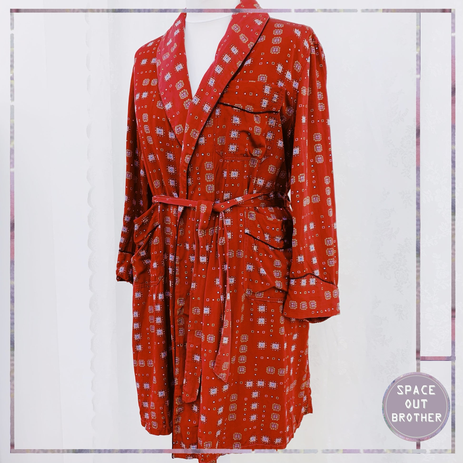 A rare and wonderful unique find. This French Vintage Dressing Gown is in a deep red almost claret colour and patterned throughout. Matching belt and exterior pockets. One flaw on one pocket. Please see last photo. Overall very well presented.
