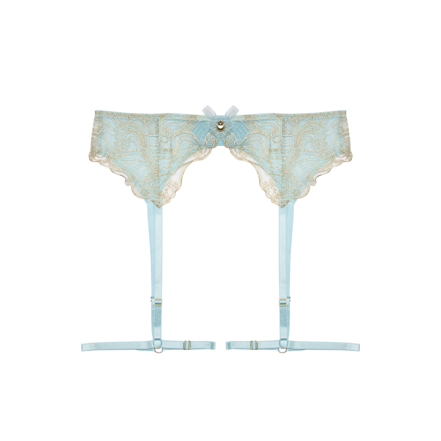Intimate moments have never looked so good then in Playful Promises beautiful Ayaka... The Ayaka Blue Wave Embroidery Suspender Belt with Leg Harness features soft baby blue mesh with a delicate shimmery gold embroidery overlay. The gold embroidery design represents waves with a little gold seashell charm in the centre for the full beachy look. The four suspender straps and leg harnesses are adjustable to ensure the perfect fit. Match the Ayaka Suspender Belt with the Ayaka Balconette Bra and Tanga Thong or Brief for the lingerie set of dreams.