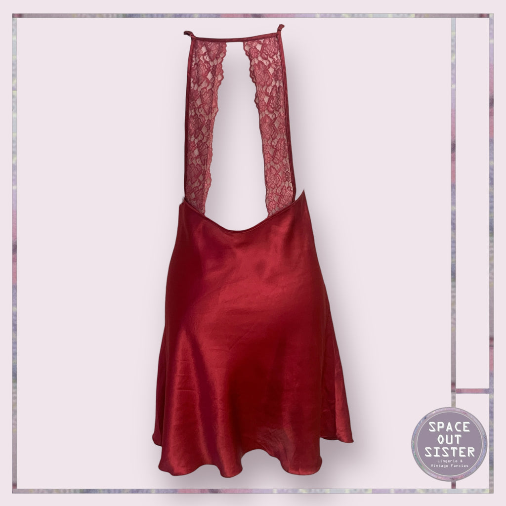 This Vintage Racer Back Slip Dress is a must-have for any fashion-forward individual. The bold red color paired with a pink racer back creates a unique and eye-catching look. The slip dress design adds a touch of elegance and versatility.
