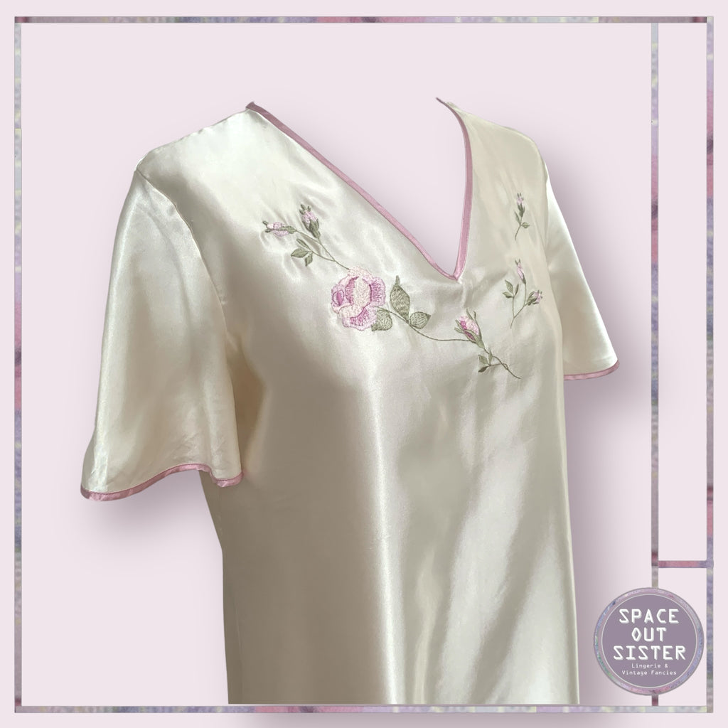 Enjoy a comfortable and elegant night's sleep with our vintage satin nightdress from M&S. The loose fit and delicate ivory color provide a classic and timeless look, while the beautiful mauve floral embroidery adds a touch of femininity. Made with high-quality materials, this nightdress is perfect for indulging in luxurious sleep.