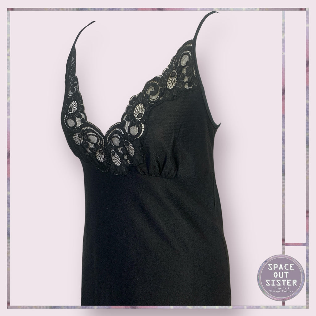 Upgrade your wardrobe with this charming Vintage V Neck Mini Slip Dress. The black dress features a deep lace on the v neckline and hemline, adding a touch of elegance to its fun vintage design.